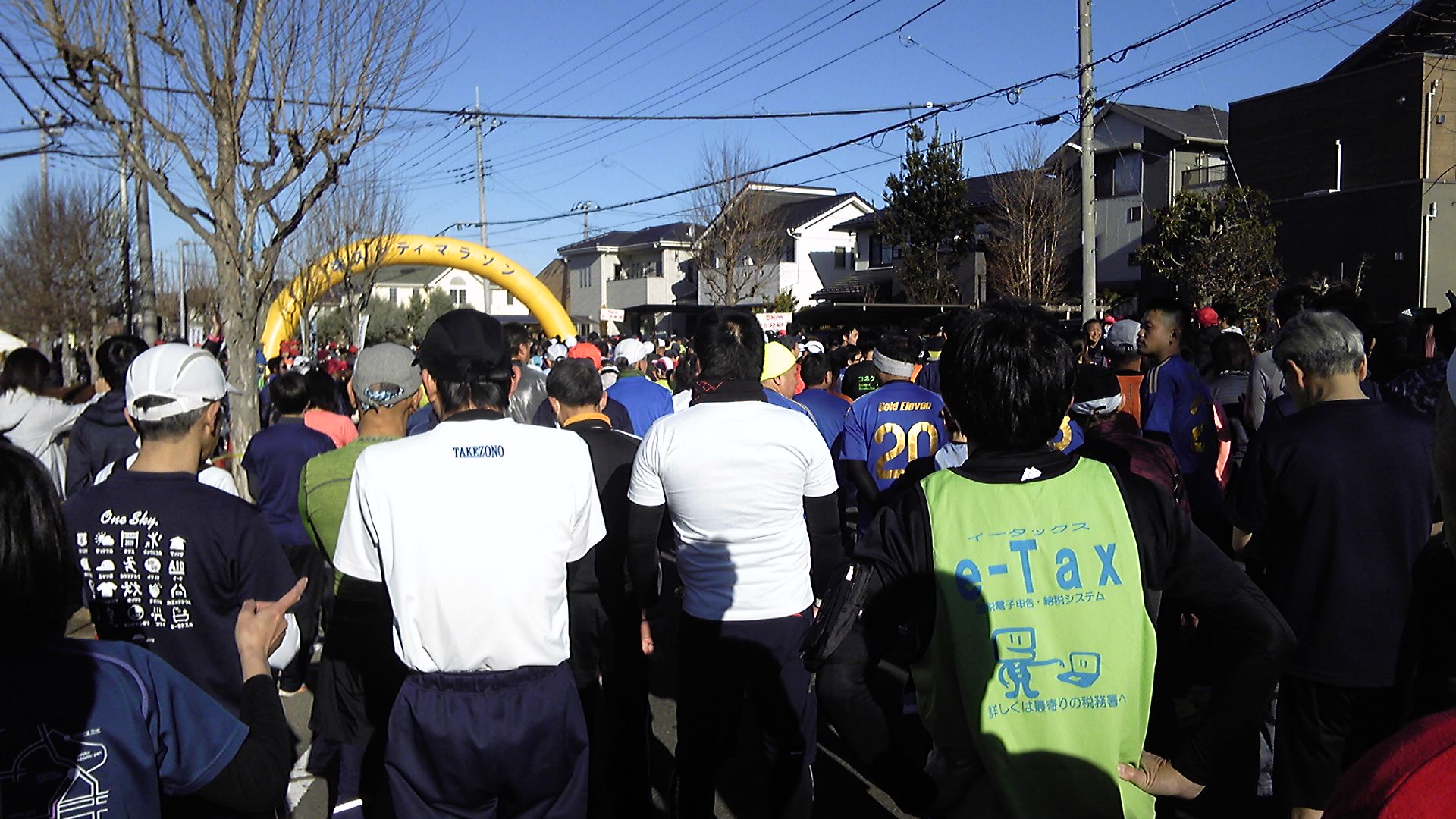 牛久シティマラソンスタート間近。ひたち野うしくの住宅街がスタート/ゴールで、スタート後しばらくは一戸建ての街並みを走ります。e-TAXのユニフォームが見えますが、出場者名簿を見ると龍ヶ崎税務署チームのようです。