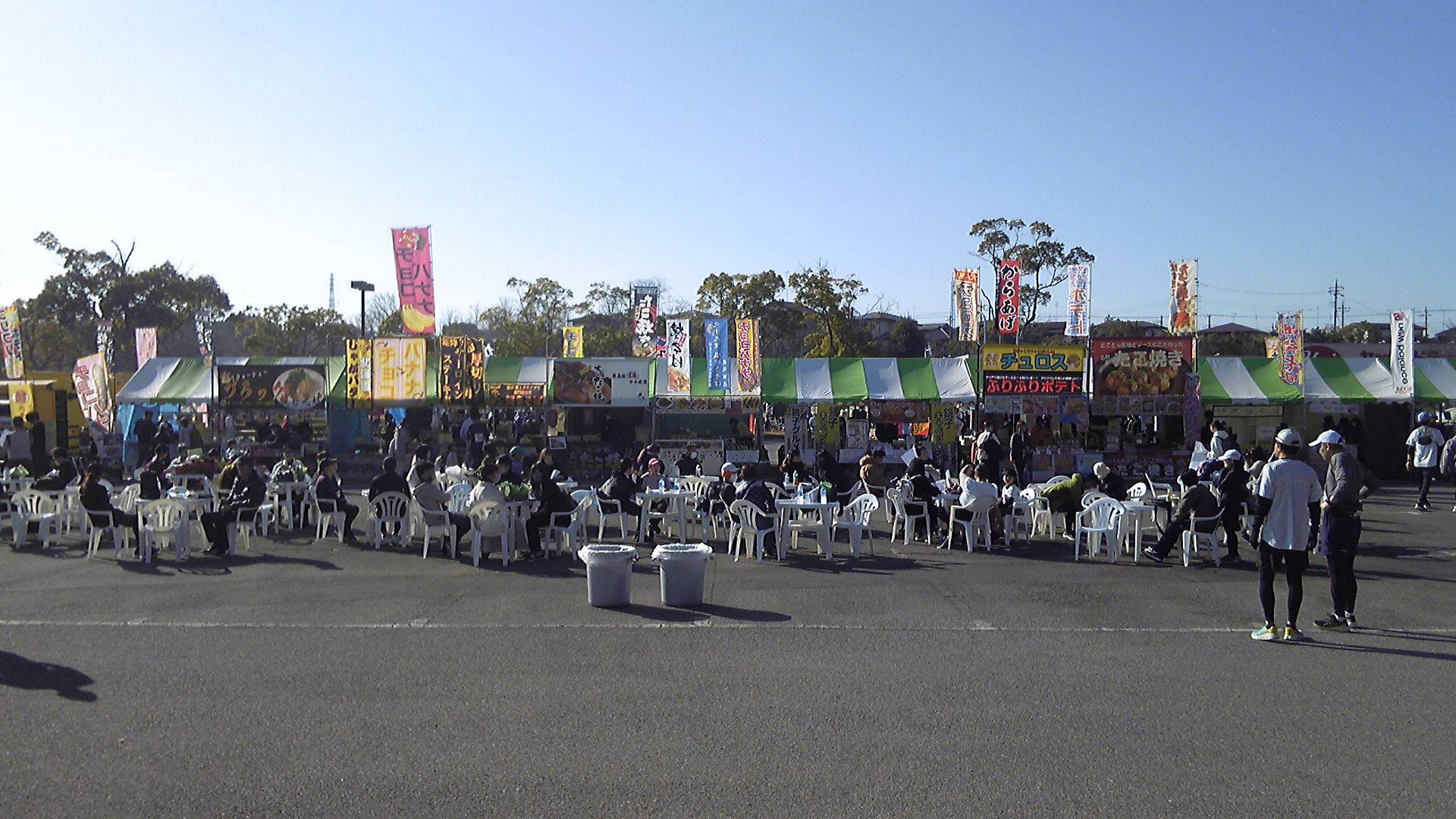 運動公園に戻ると、テニスコートに誘導され、ここで計測タグの取り外し・返却。そのままコートを横切って参加賞のタオル受け渡し。すぐ横でバナナの補給はうれしかった。その少し先で、ポカリ300ccのドリンクサービス。さらに体育館前で豚汁、流れがスムーズである。