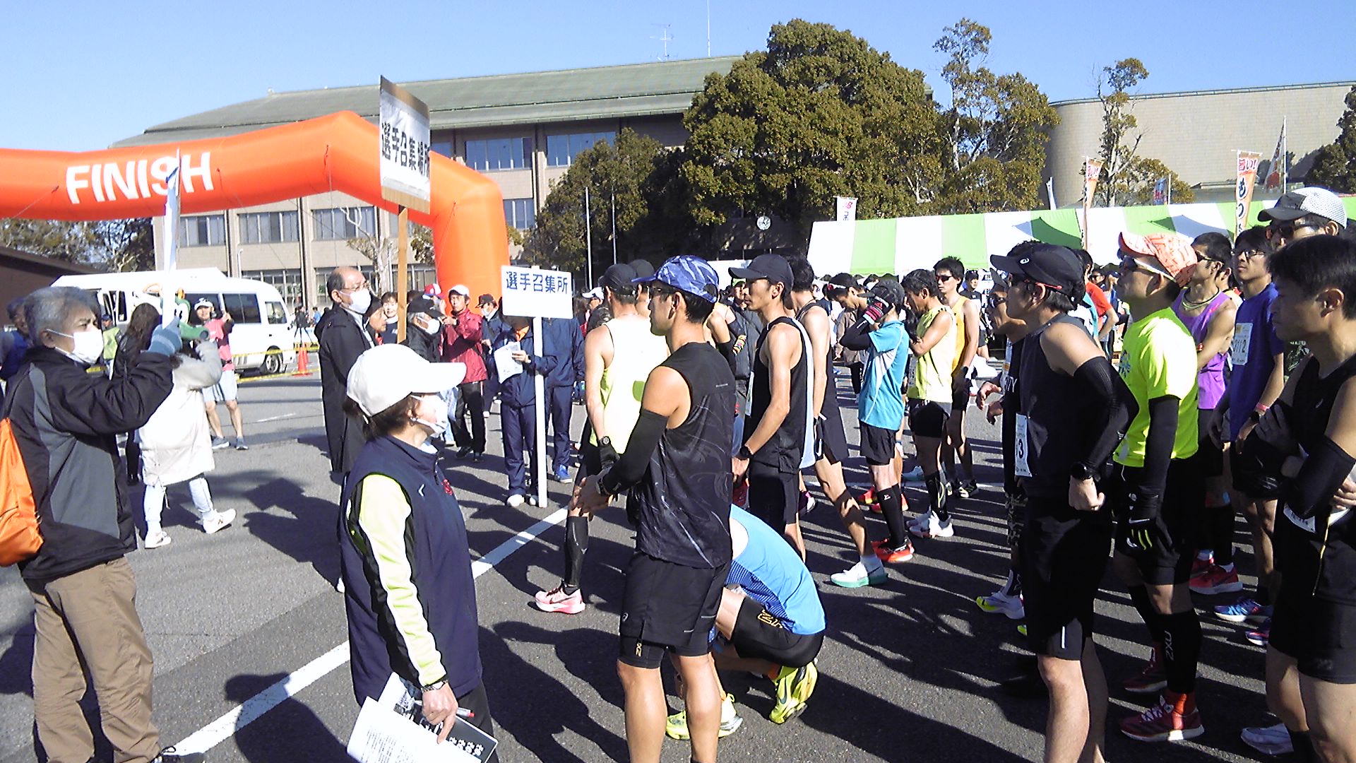 スタート15分前になると、ランナーは召集所に集まるようアナウンスがある。最後方でよければ、直接スタートに並んでも大丈夫。