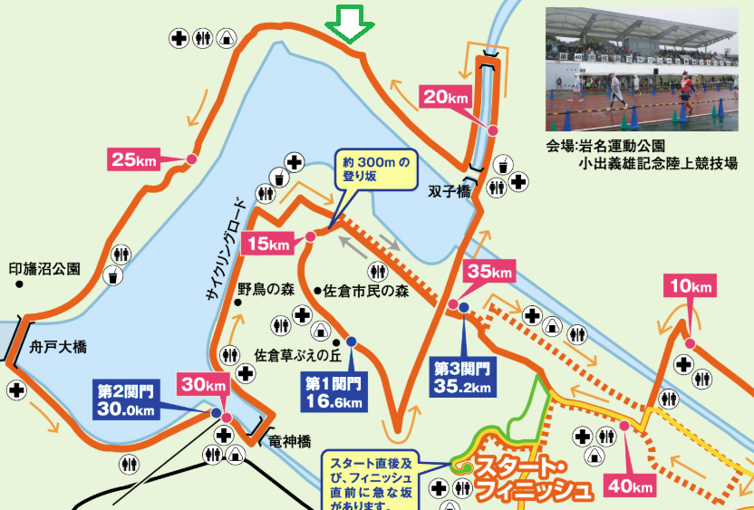 しばらく自宅療養していたので、リハビリを兼ねて佐倉マラソンの応援(見学)に出かけた。22km付近で、練習で何回か走ったあたりである(矢印のあたりで応援)。