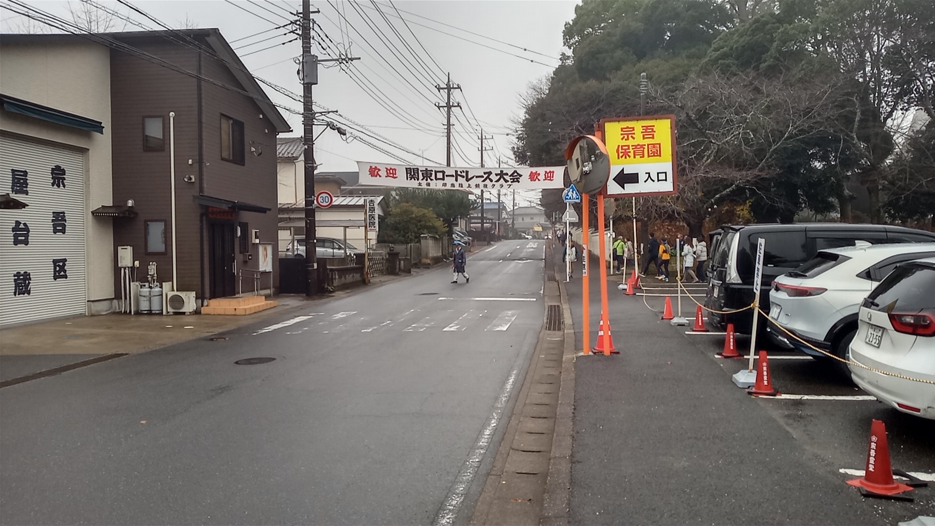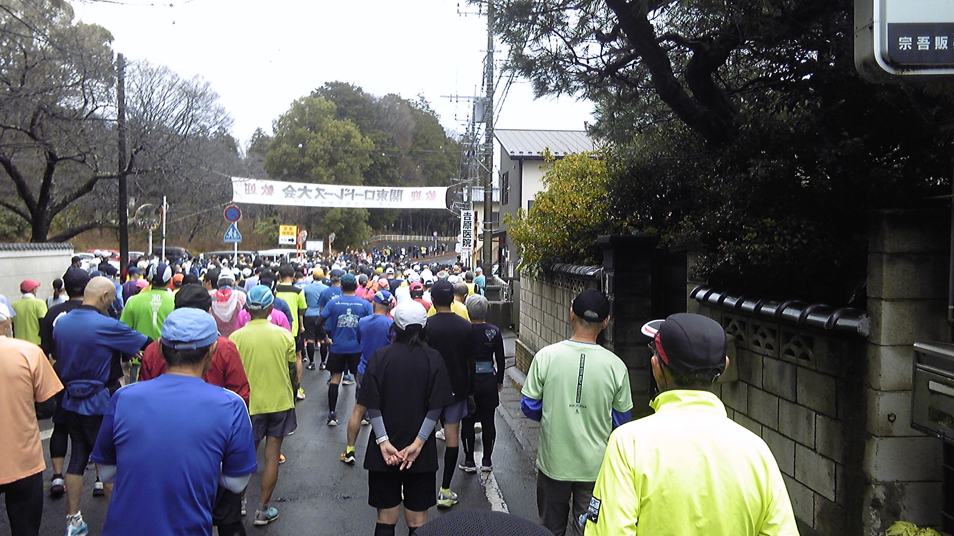 30分前にスタート地点に向かうと、小学校入口にすでに「満車」の掲示が出ていた。再度、宗吾霊堂に向かう。学生さん達の多い大会で、普段のマラソン大会より年齢層が若い。順天堂や明治のユニフォームを着たランナーが、歩道でウォームアップに余念がない。