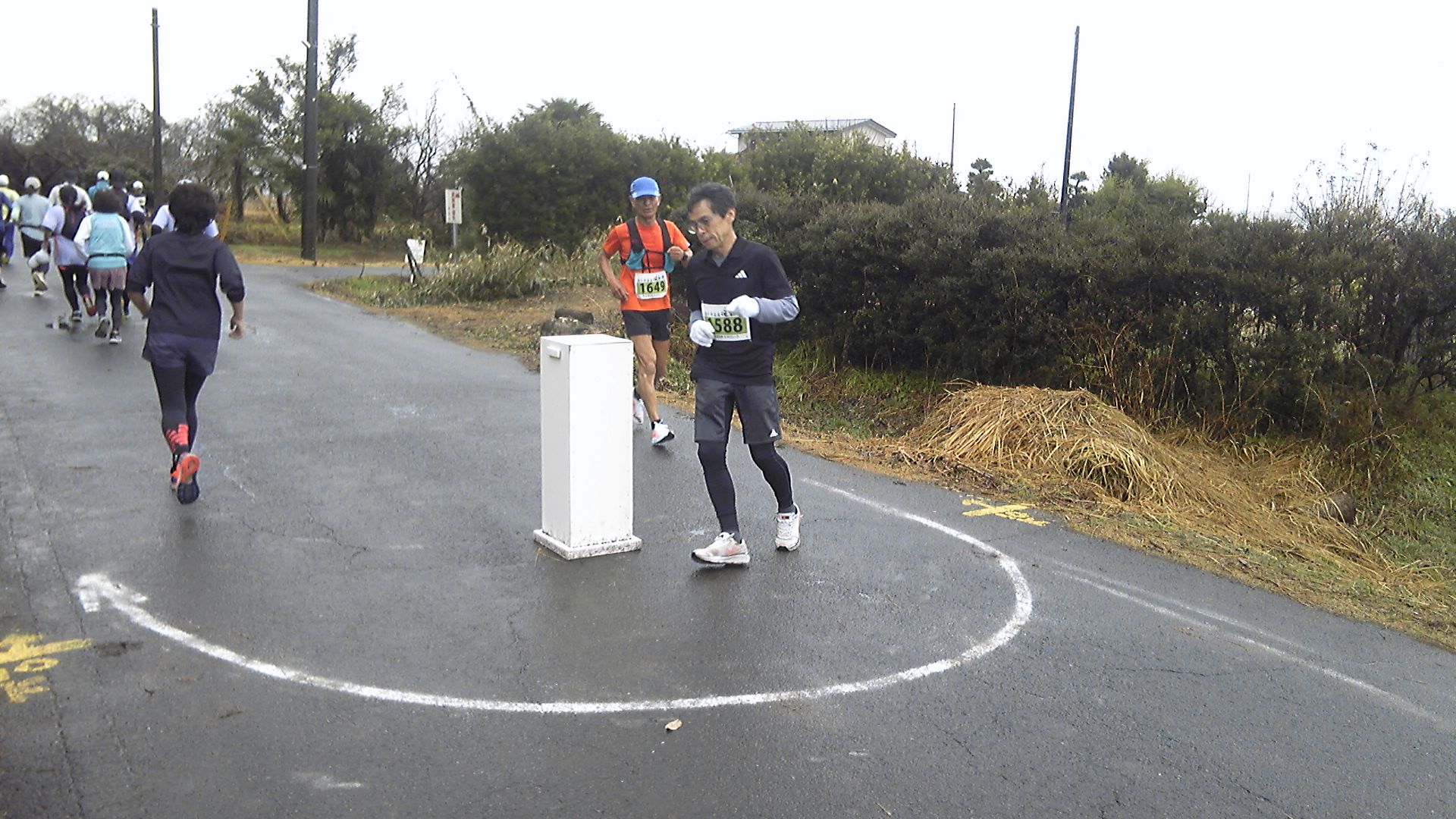 折返しコーンを撮影するつもりだったが、ここで止められ制限時間オーバーと言われたら目も当てられない。さっさと折り返して登り坂。ピークに達した場所で、いったん止まってコースを撮影。反対側のコースを見ると、まだランナーが続いていた。