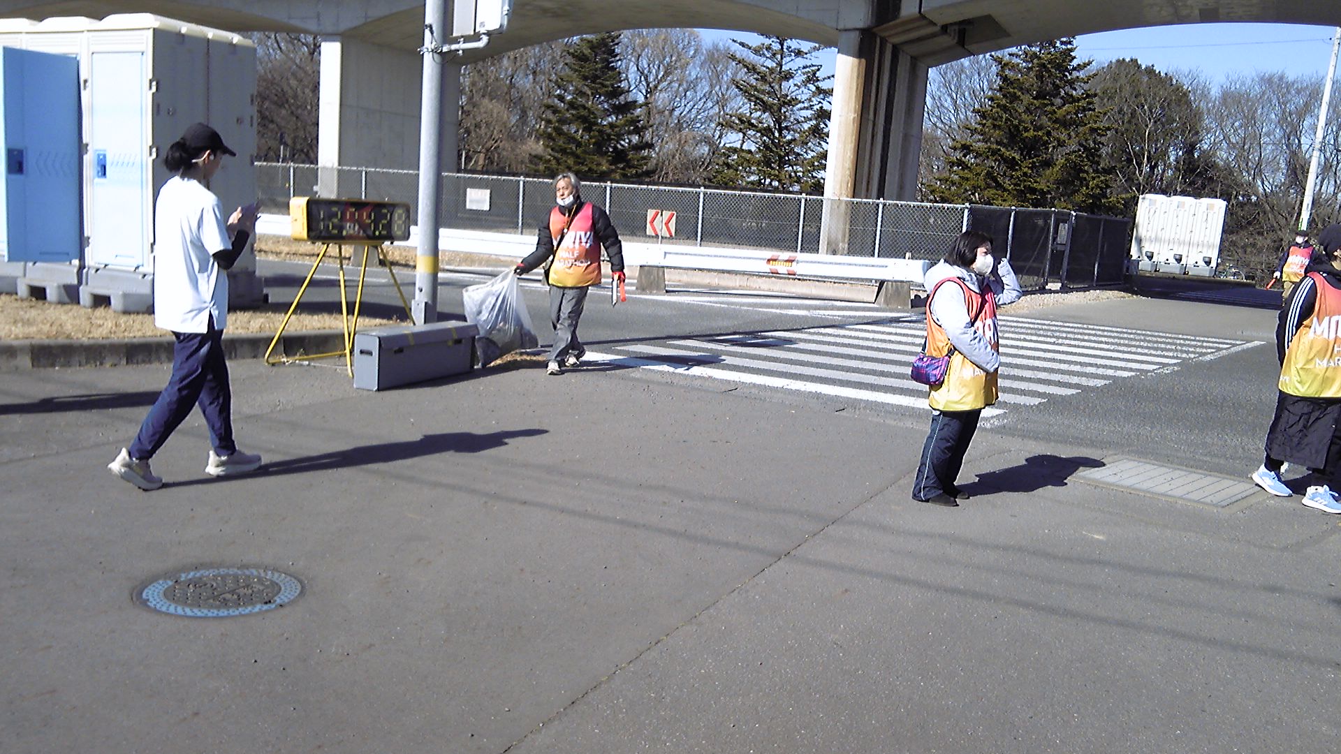 交差点に戻り確認すると、関門時間なのでレースを中止してバスに乗ってくださいとのこと。電光表示を確認すると、2時間4分台で確かに関門時間は超えている。とはいえ、通り過ぎたのはおそらく2分台で、1分しかオーバーしていない。途中で写真を撮っている時間だけオーバーしたことになる。