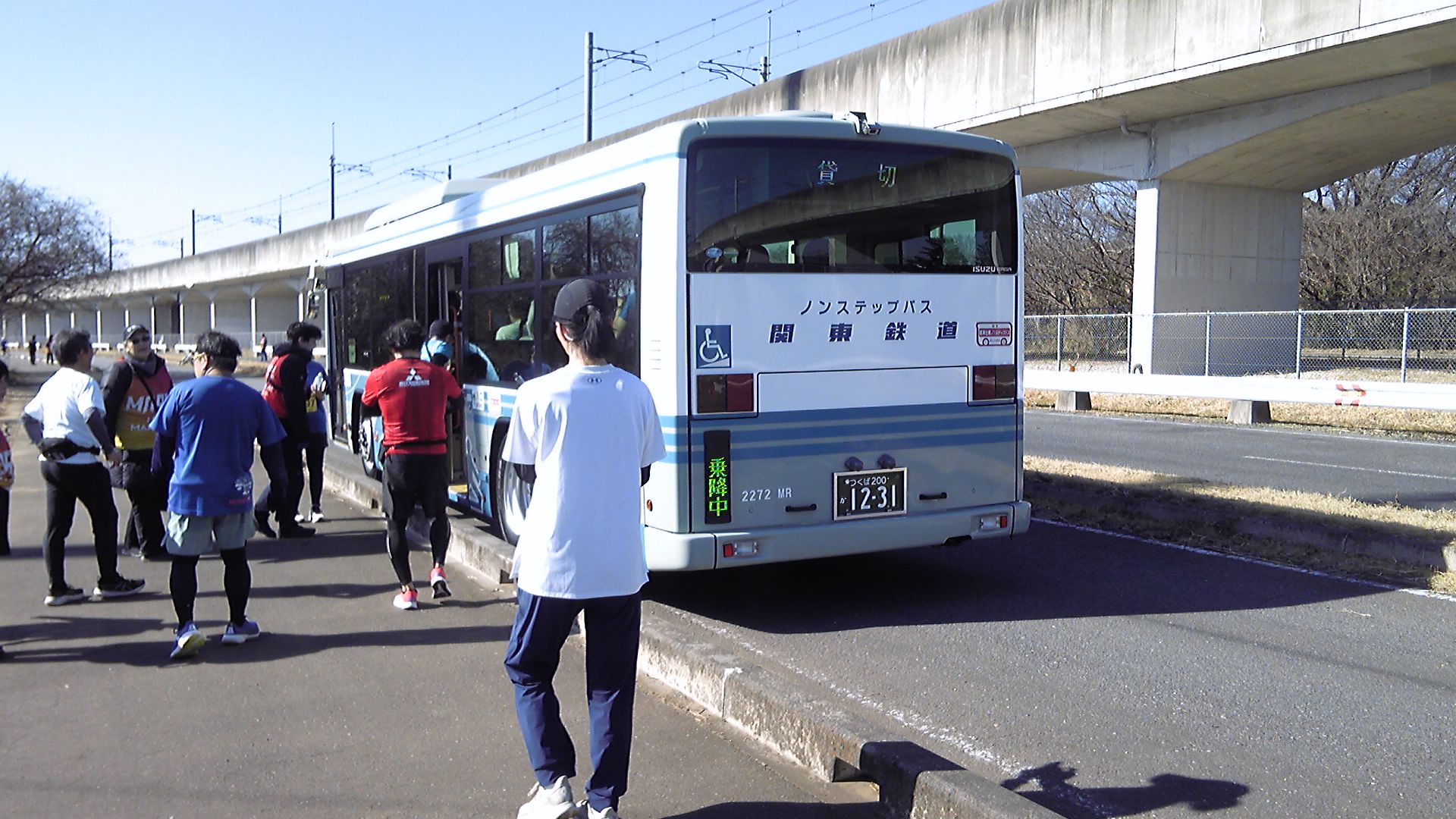 すでにバスの座席は埋まっていて、立っている人もいる。1分オーバーの私でこれだから、おそらく関門時間ぴったりに閉めたものと思われた。開催要項に書いてあるから文句は言えないものの、スタートまでの待ち行列、ロスタイムを勘案すると、km7分で走っても間に合わない。