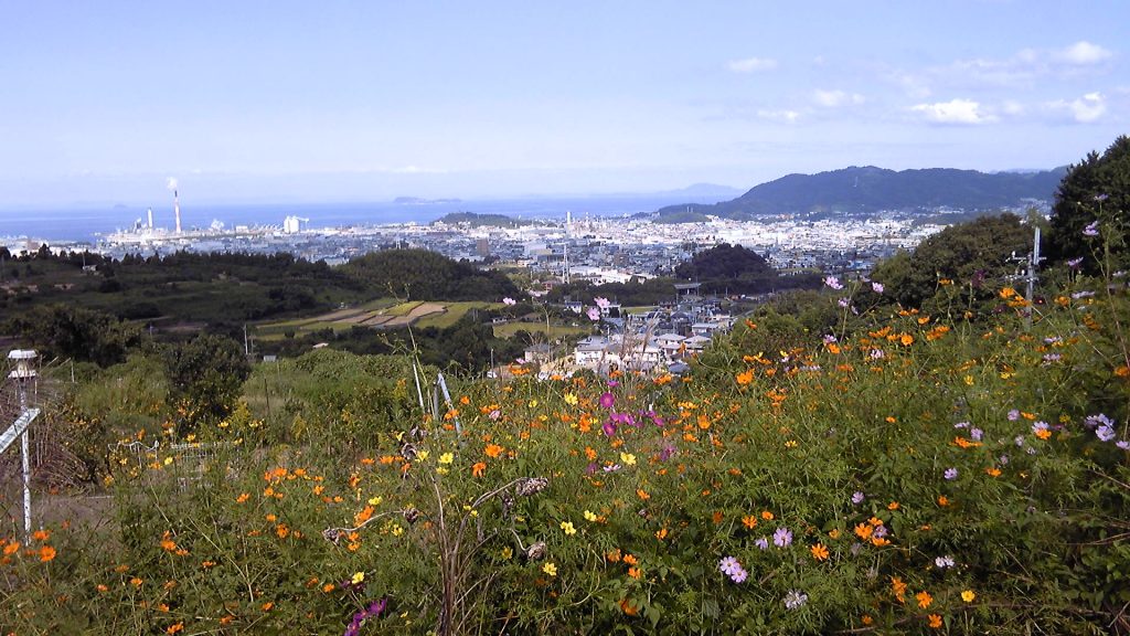 みかん畑の上にある休憩所から、瀬戸内海の景色が広がる。休んでいたら、わざわざ急傾斜を登ってきてくださって、みかんをご接待していただいた。ありがたいことです。