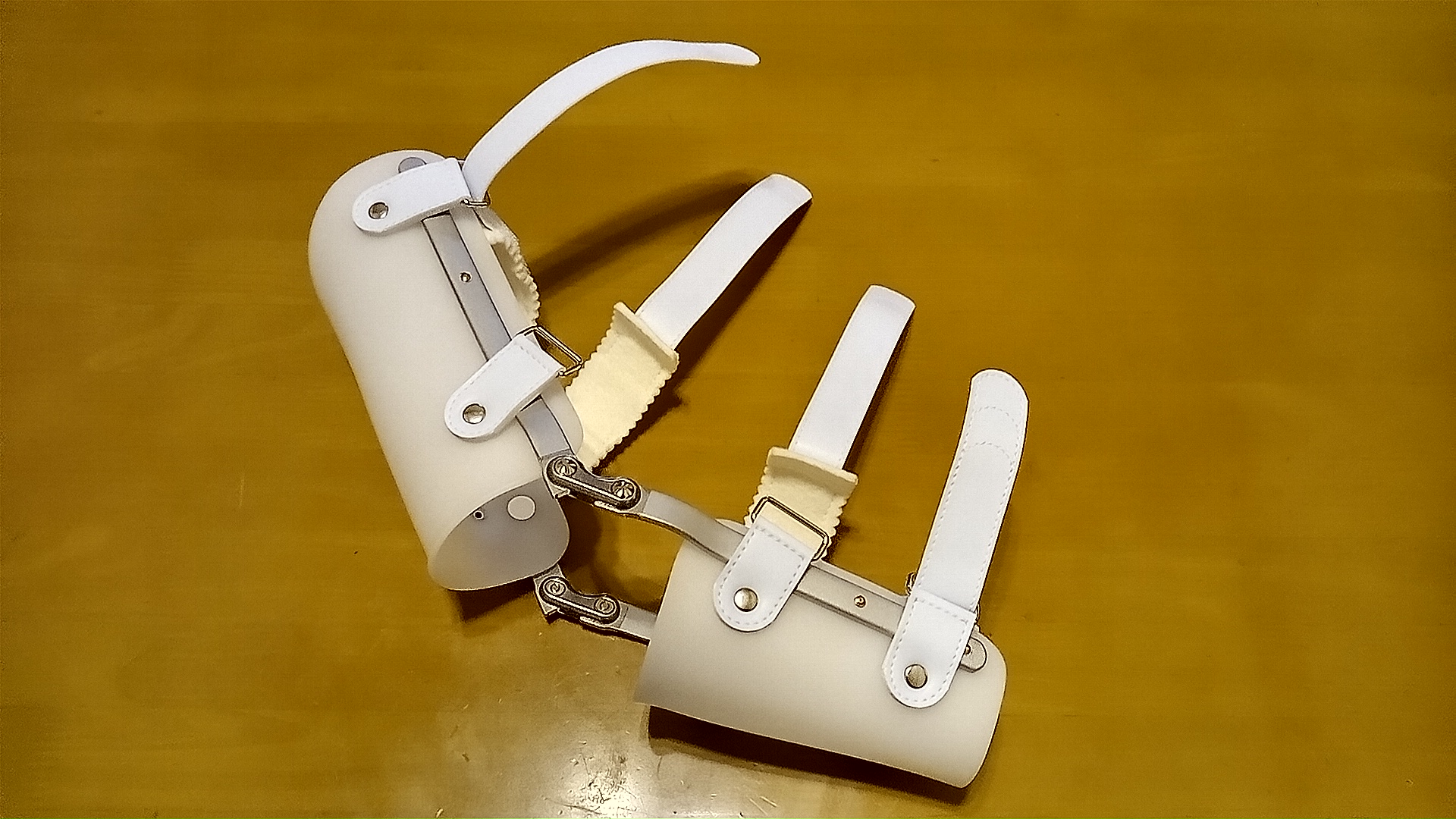 下の写真がその装具で、ちゃんと採寸して作ったオーダーメイドである。7万円以上するが、値段だけのことはあってなかなか優れもので、これがないと痛くて動かせないらしい。ギブスほどではないがやっぱり重くて、肩が痛くなるのは相変わらずである。