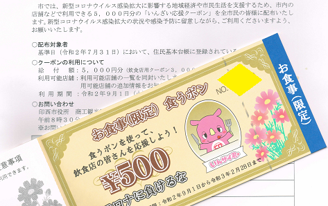 今夏の資金繰りは、コロナ効果で少しだけ改善した。印西市から住民に配られたお食事券「食うポン」。