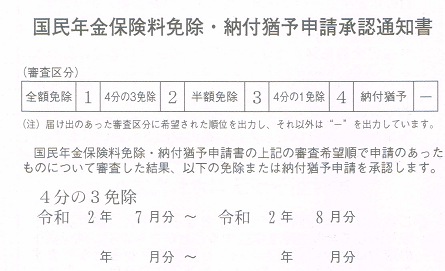 例によって審査には時間がかかり、9月に入ってようやく審査結果の通知が届いた。「4分の3免除」である。リタイア1年目は免除なし、2年目は全額免除、3年目が2分の1免除で、4年目の今年が4分の3。4分の1免除が揃えば四喜和だった。